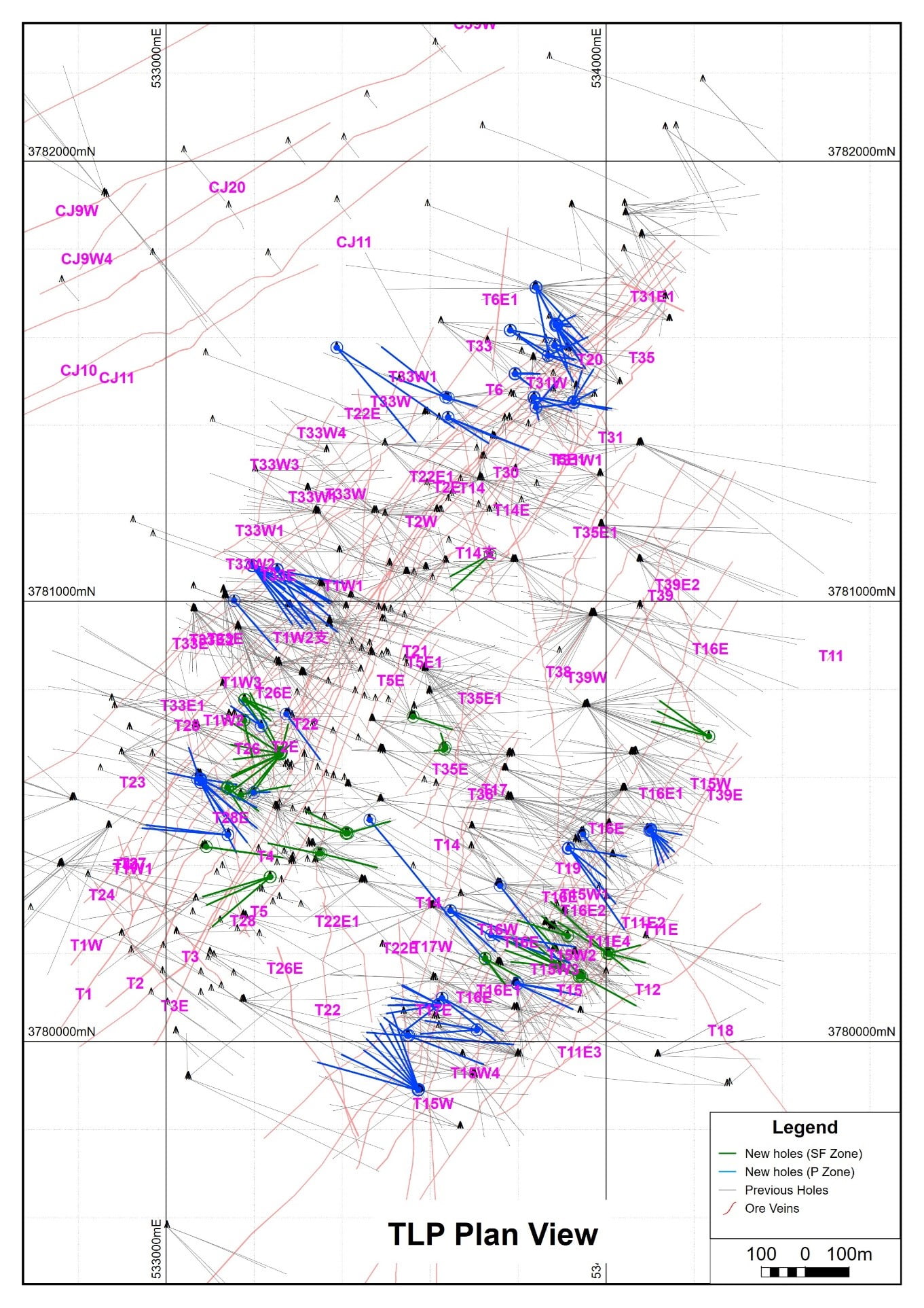 - Underground hole ZKT1008 intersected 938 g/t Ag, 7.97% Pb, 0.62% Zn, 0.12 g/t Au, and 0.17% Cu over a 1.73 m interval of vein T14E at the 918 m elevation