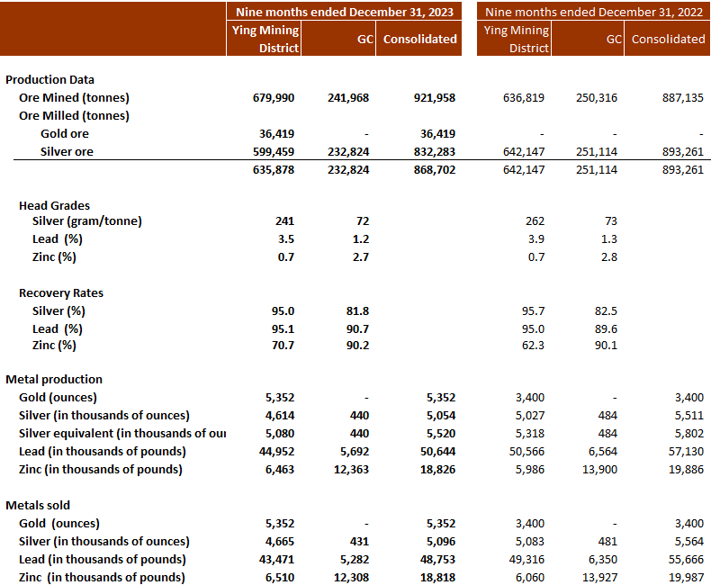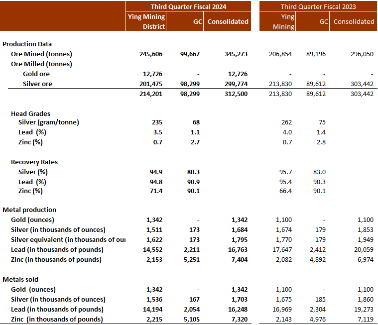 At the Ying Mining District, 245,606 tonnes of ore were mined, up 19% over Q3 Fiscal 2023, and 214,201 tonnes of ore were milled, a slight increase over Q3 Fiscal 2023. Approximately 1.5 million ounces of silver, 1,342 ounces of gold (or 1.6 million ounces of silver equivalent), 14.6 million pounds of lead, and 2.2 million pounds of zinc were produced, representing increases of 22% and 3%, respectively in gold and zinc, and decreases of 10%, 8% and 18%, respectively, in silver, silver equivalent and lead over Q3 Fiscal 2023.