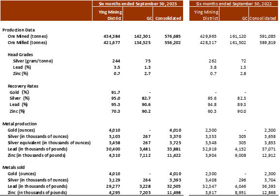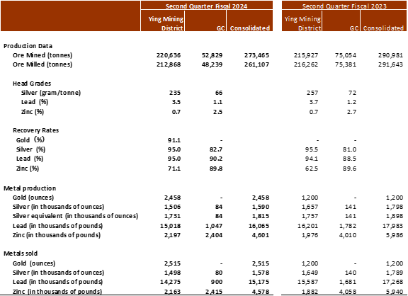 At the Ying Mining District, 220,636 tonnes of ore were mined, up 2% over Q2 Fiscal 2023, and 212,868 tonnes of ore were milled, down 2% over Q2 Fiscal 2023. Approximately 1.5 million ounces of silver, 2,458 ounces of gold (or 1.7 million ounces of silver equivalent), 15.0 million pounds of lead, and 2.2 million pounds of zinc were produced, representing increases of 105% and 11%, respectively in gold and zinc, relatively the same in silver equivalent, and decreases of 9% and 7%, respectively, in silver and lead over Q2 Fiscal 2023.