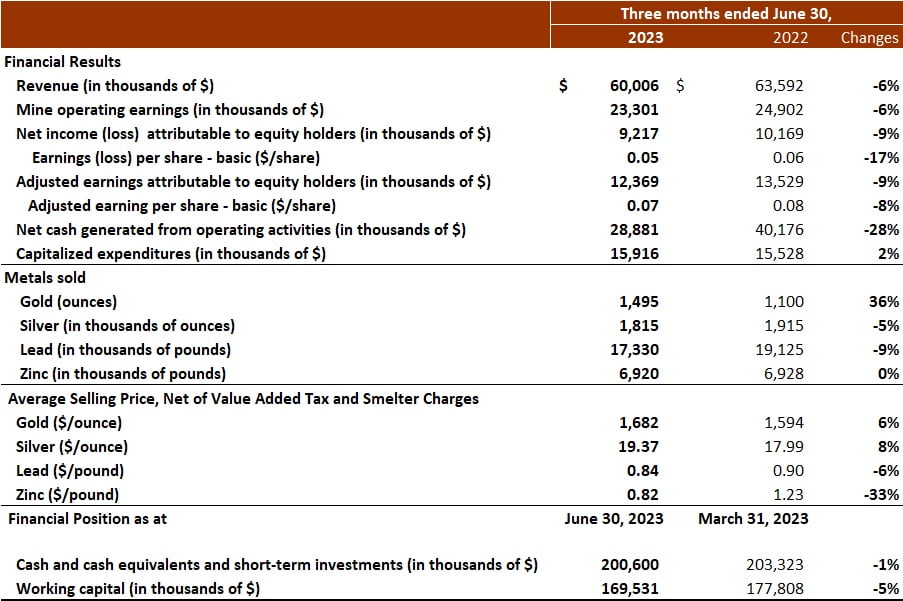 In Q1 Fiscal 2024, the Company’s consolidated financial results were mainly impacted by i) an increase of 36% in gold sold; ii) increases of 6% and 8%, respectively, in the realized selling prices for gold and silver; iii) a gain of $1.1 million on investments; iv) a decrease of 5% in per tonne production costs; offset by v) decreases of 5% and 9%, respectively, in silver and lead sold; vi) decreases of 6% and 33%, respectively, in the realized selling prices for lead and zinc; and vi) a foreign exchange loss of $2.2 million arising from the depreciation of the US dollar against the Canadian dollar.