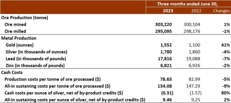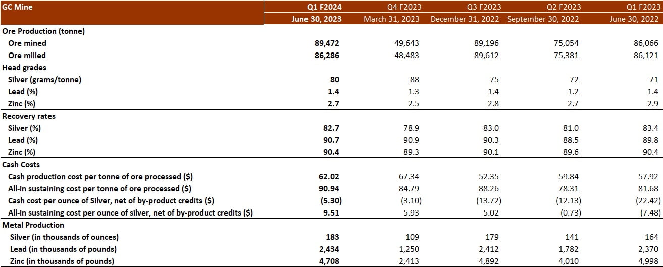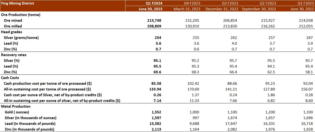 In Q1 Fiscal 2024, the Company produced approximately 1.8 million ounces of silver, 1,552 ounces of gold, 17.8 million pounds of lead, and 6.8 million pounds of zinc, representing an increase of 41% in gold production, and decreases of 4%, 7% and 2%, respectively, in silver, lead and zinc production over Q1 Fiscal 2023. The lower silver and lead production is primarily due to a decrease in head grades at the Ying Mining District in line with the mining sequence and Mineral Reserves.
