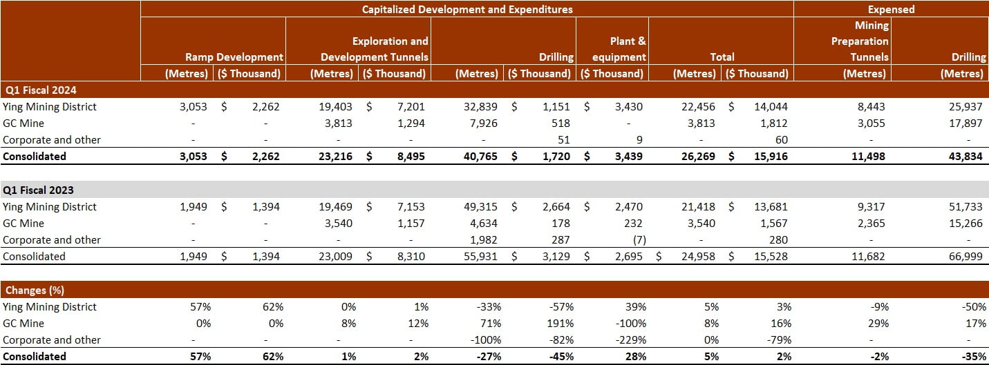 In Q1 Fiscal 2024, on a consolidated basis, a total of 84,599 metres or $2.7 million worth of diamond drilling were completed (Q1 Fiscal 2023 – 122,930 metres or $4.9 million), of which approximately 43,834 metres or $1.0 million worth of underground drilling were expensed as part of mining costs (Q1 Fiscal 2023 – 66,999 metres or $1.8 million) and approximately 40,765 metres or $1.7 million worth of drilling were capitalized (Q1 Fiscal 2023 – 55,931 metres or $3.1 million). In addition, approximately 11,498 metres or $4.0 million worth of preparation tunnelling were completed and expensed as part of mining costs (Q1 Fiscal 2023 – 11,682 metres or $4.1 million), and approximately 26,269 metres or $10.8 million worth of tunnels, raises, ramps and declines were completed and capitalized (Q1 Fiscal 2023 – 24,958 metres or $9.7 million).