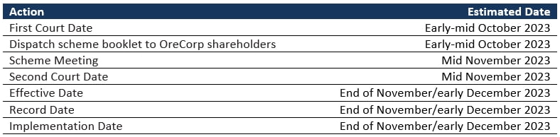 - The Scheme is subject to various customary closing conditions, including OreCorp shareholder approval and Court approval.