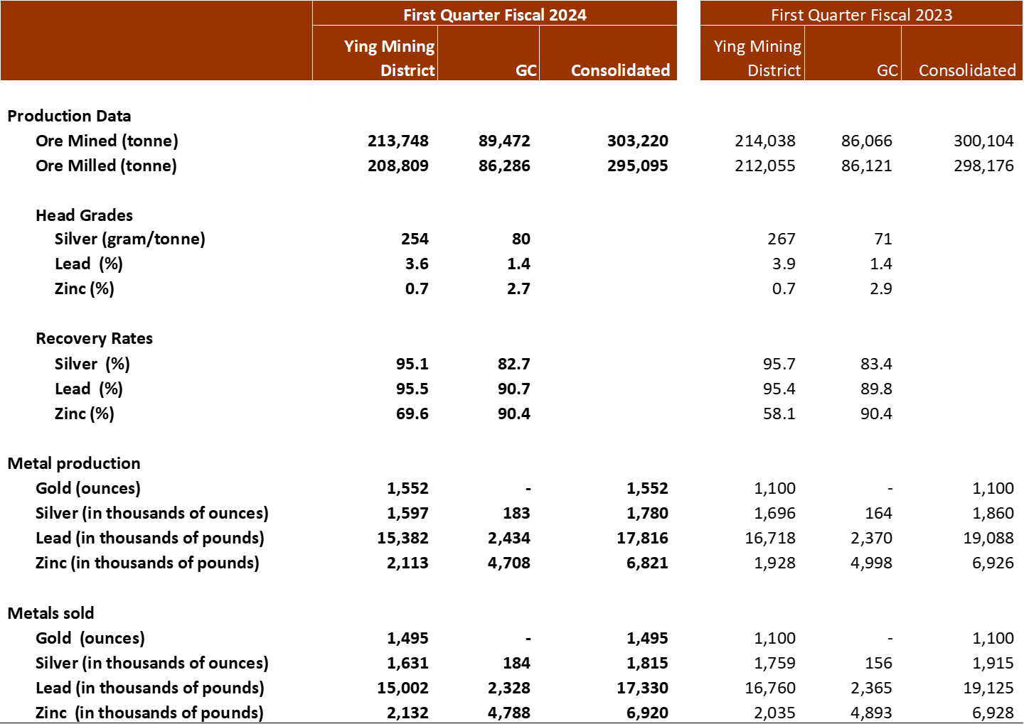 At the Ying Mining District, 213,748 tonnes of ore were mined, effectively the same as Q1 Fiscal 2023, and 208,809 tonnes of ore were milled, down 2% over Q1 Fiscal 2023. Approximately 1.6 million ounces of silver, 1,552 ounces of gold, 15.4 million pounds of lead, and 2.1 million pounds of zinc were produced, representing increases of 41% and 10%, respectively in gold and zinc, and decreases of 6% and 8%, respectively, in silver and lead over Q1 Fiscal 2023.
