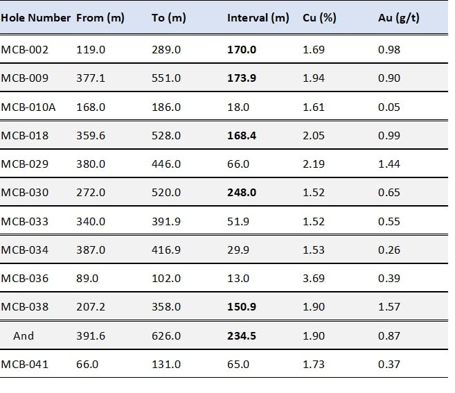 A maiden JORC Compliant Mineral Resource Estimate (MRE) was released for the MCB Project in January 2021, reporting 290.3 million tonnes of Indicated Resources grading 0.48% copper and 0.15 grams per tonne (“g/t”) gold, and 23.5 million tonnes of Inferred Resources grading 0.48% copper and 0.10 g/t gold.