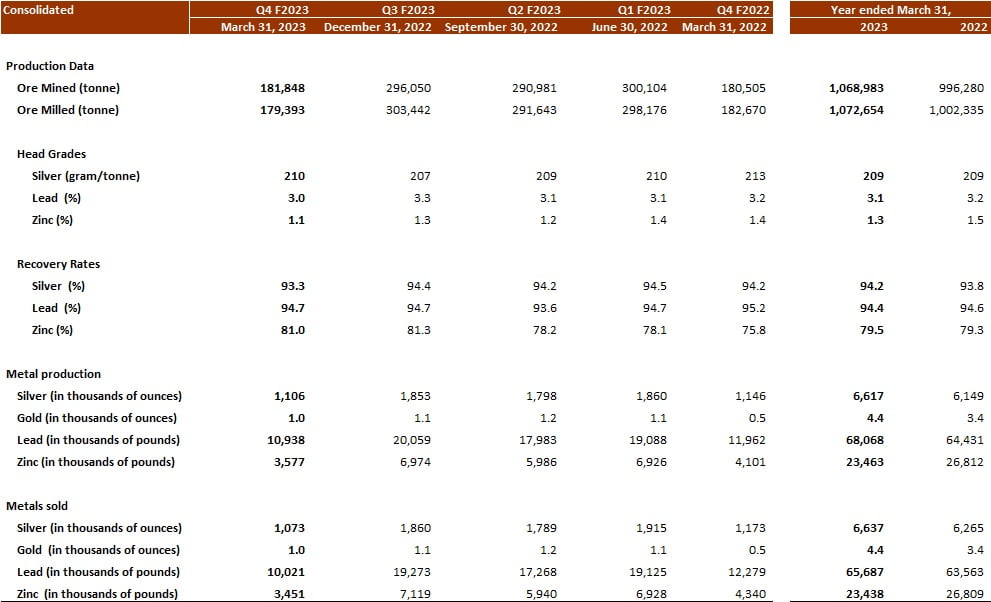 - On a consolidated basis, 1,068,983 tonnes of ore were mined, and 1,072,654 tonnes of ore were milled, both up 7% over Fiscal 2022. Approximately 6.6 million ounces of silver, 4,400 ounces of gold, 68.1 million pounds of lead, and 23.5 million pounds of zinc were produced, representing increases of 8%, 29%, and 6%, respectively, in silver, gold, and lead, and a decrease of 12% in zinc compared to Fiscal 2022.