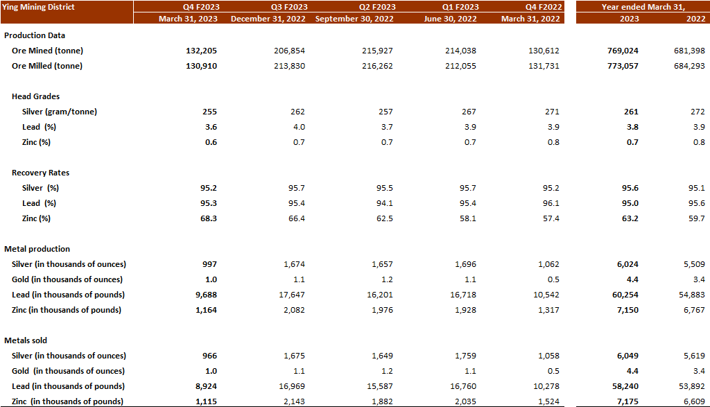 - At the Ying Mining District, 769,024 tonnes of ore were mined, and 773,057 tonnes of ore were milled, both up 13% over Fiscal 2022. Approximately 6.0 million ounces of silver, 4,400 ounces of gold, 60.3 million pounds of lead, and 7.2 million pounds of zinc were produced, representing increases of 9%, 29%, 10% and 6%, respectively, in silver, gold, lead and zinc over Fiscal 2022.