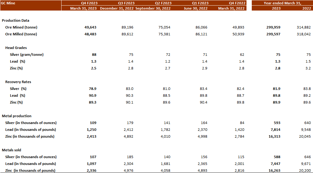 - At the GC Mine, 299,959 tonnes of ore were mined, down 5% over Fiscal 2022, and 299,597 tonnes of ore were milled, down 6% over Fiscal 2022. Approximately 593 thousand ounces of silver, 7.8 million pounds of lead, and 16.3 million pounds of zinc were produced, representing decreases of 7%, 18% and 19%, respectively, in silver, lead and zinc compared to Fiscal 2022. The decrease can be attributed mainly to the upgrades made to the ventilation and electric power facilities at the GC Mine to comply with newly-implemented safety production regulations. These improvements impacted operations during the second quarter but were completed in the third quarter.