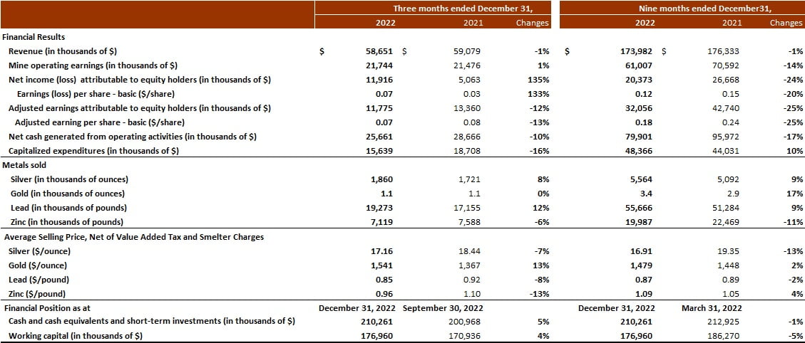 In Q3 Fiscal 2023, the Company’s consolidated financial results were mainly impacted by i) increases of 8% and 12%, respectively, in silver and lead sold, and a decrease of 6% in zinc sold; ii) decreases of 7%, 8%, and 13%, respectively, in the realized selling prices for silver, lead and zinc, and an increase of 13% in the realized selling price for gold; iii) a foreign exchange loss of $0.8 million arising from the depreciation of the US dollar against the Company’s functional currencies, mainly the Chinese yuan and Canadian dollar; and iv) a gain of $3.0 million on equity investments.