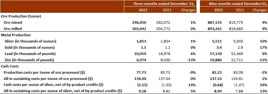In Q3 Fiscal 2023, the Company produced approximately 1.9 million ounces of silver, 1,100 ounces of gold, 20.1 million pounds of lead, and 7.0 million pounds of zinc, representing increases of 1%, 0%, and 6%, respectively, in silver, gold and lead production, and a decrease of 13% in zinc production over Q3 Fiscal 2022.