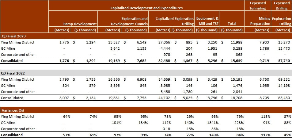In addition to the capitalized tunneling and drilling work, the Ying Mining District also plans to complete and expense 25,800 metres of mining preparation tunnels and 71,400 metres of diamond drilling, representing decreases of 18% and 44%, respectively, compared to the expected results in Fiscal 2023.