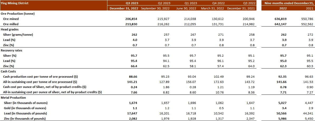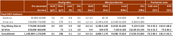 In Fiscal 2024, the Company plans to mine and process 770,000 to 810,000 tonnes of ore at the Ying Mining District, including 30,000 – 40,000 tonnes of gold ore with an expected head grade of 3.6 g/t gold, to produce approximately 4,400 to 5,500 ounces of gold, 6.2 to 6.5 million ounces of silver, 62.9 to 65.6 million pounds of lead, and 9.1 to 9.5 million pounds of zinc. Fiscal 2024 production guidance at the Ying Mining District represents production increases of approximately 0% to 5% in ore, 1% to 26% in gold, 3% to 8% in silver, 4% to 8% in lead, and 21% to 26% in zinc compared to the expected production results in Fiscal 2023.