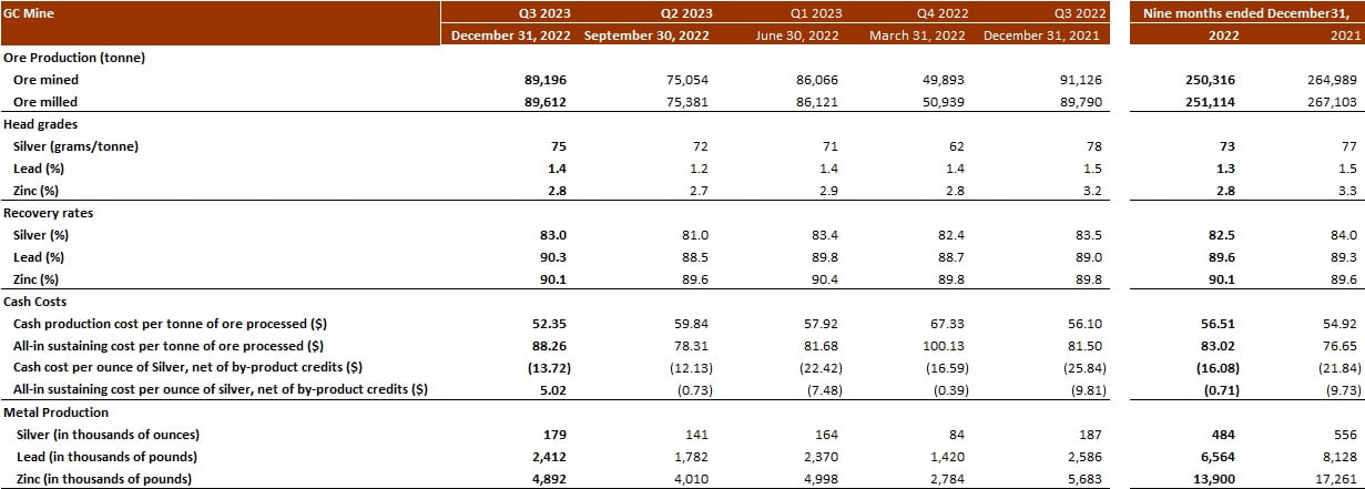 In Fiscal 2024, the Company plans to mine and process 330,000 to 360,000 tonnes of ore at the GC Mine to produce 620 to 670 thousand ounces of silver, 7.5 to 8.2 million pounds of lead, and 18.5 to 20.1 million pounds of zinc. Fiscal 2024 production guidance at the GC Mine represents production increases of approximately 11% to 21% in ore, 4% to 14% in silver, -2% to 6% in lead, and 12% to 21% in zinc production compared to the expected results in Fiscal 2023.