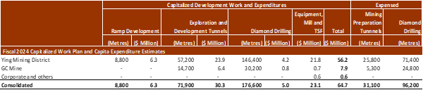 In Fiscal 2024, the GC Mine plans to: i) complete and capitalize 14,700 metres of exploration and development tunnels at estimated capital expenditures of $6.4 million, an increase of 12% in meterage and an increase of 42% in cost mainly due to increased tunnel dimension to allow small scale mechanized equipment access, compared to the expected results in Fiscal 2023; ii) complete and capitalize 30,200 metres of diamond drilling at an estimated cost of $0.8 million, representing a 100% increase in meterage and cost to prepare for future production, compared to the expected results in Fiscal 2023; and iii) spend $0.7 million on equipment and facilities. The total capital expenditures at the GC Mine are budgeted at $7.9 million in Fiscal 2024, down $0.5 million compared to the expected results in Fiscal 2023.