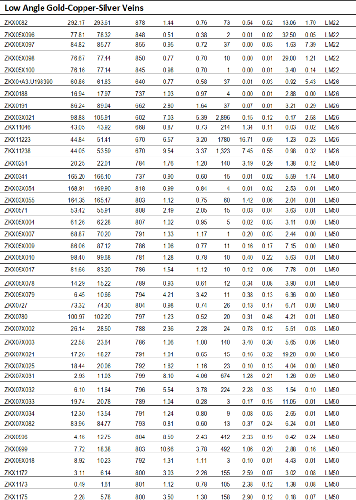 - Hole ZKX03X021 intersected a 7.03 m interval (5.39 m true width) of vein LM26 grading 0.17 g/t gold (“Au”), 2,896 g/t Ag, and 2.58% Cu, at the 602 m elevation;