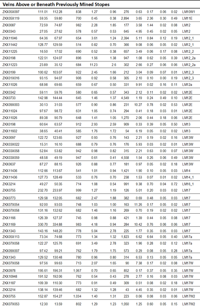 Most holes in this period targeted blocks of known silver-lead-zinc veins in the production areas that were previously missed due to limited drilling or tunneling, changes in the strikes and dips, and/or pinch-swelling of the pay-zones in the veins. The high-grade intercepts are mainly associated with the southwest-striking LM7 series, LM12 series and LM17 series of veins, and the northwest-striking LM8 series, LM19 and LM20E.