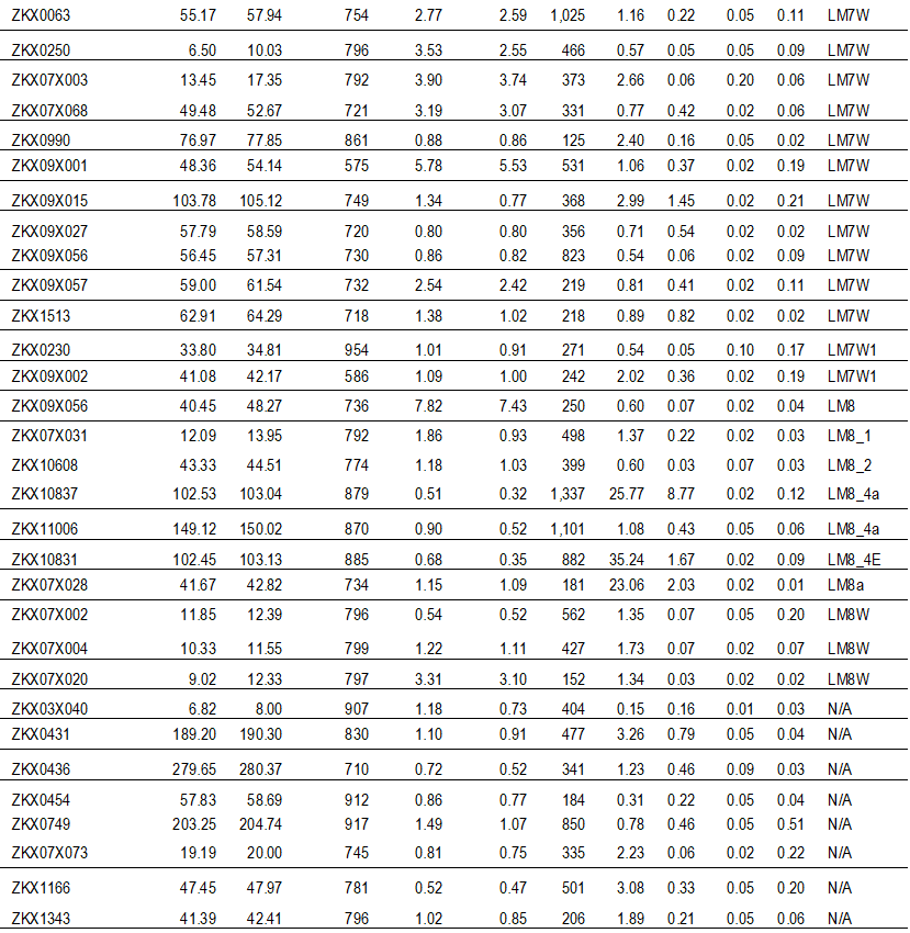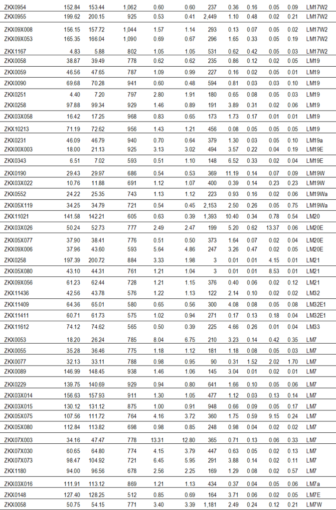 - Hole ZKX05X096 intersected a 0.51 m interval (0.38 m true width) of vein LM22 grading 32.50 g/t Au, 2 g/t Ag, and 0.05% Cu, at the 848 m elevation.