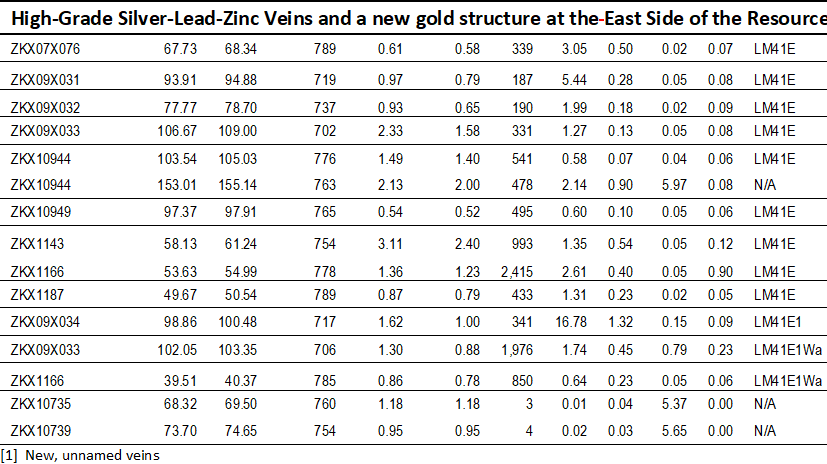 At the east side of the resource area, drilling intersected high-grade silver-lead-zinc vein LM41E and the parallel silver-lead-zinc veins LM41E1 and LM41E1Wa with true widths up to 2.40 m.