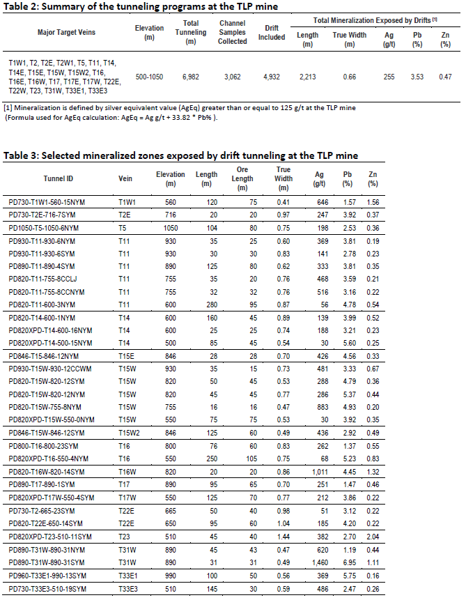 A total of 6,982 m of exploration tunnels were developed at the TLP mine during this period. The exploration tunneling, comprised of drifting, cross-cutting and raising, was driven along and across major mineralized vein structures to upgrade the drill-defined mineral resources, and to test for new parallel and splay structures (Tables 2 and 3).