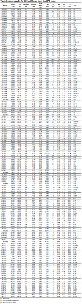 - Underground hole ZK11206 intersected a 1.33 m interval (1.10 m true width) of vein H41W grading 2.86 g/t Au, 1,469 g/t Ag, 3.69% Pb, 2.33% Zn, and 0.13% Cu from 66.90 m depth, at an elevation of 613 m;
