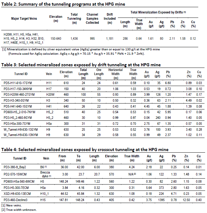 A total of 1,436 m of exploration tunnels were developed at the HPG mine during this period. The exploration tunneling, which comprised of drifting, cross-cutting and raising, was driven along and across major mineralized vein structures to upgrade the drill-defined mineral resources, and to test for new parallel and splay structures (Tables 2 and 3).