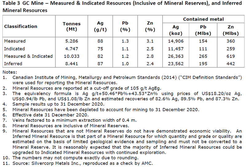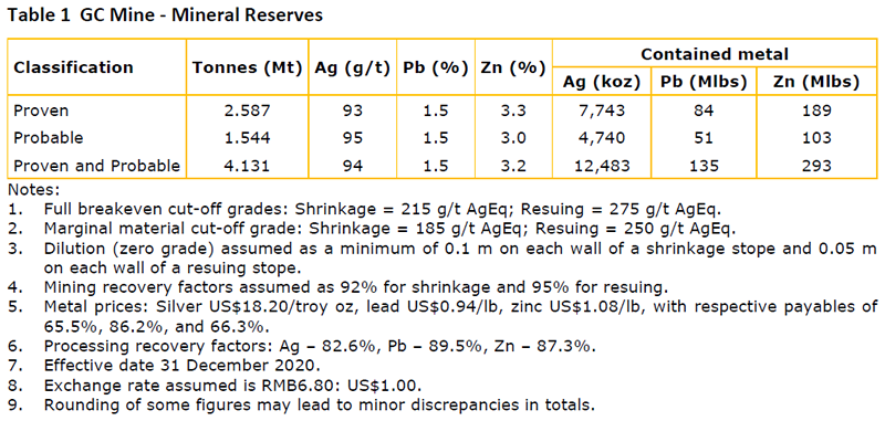From the start of operations at the GC Mine in 2014 through to December 31, 2020, 1,853,662 tonnes have been mined at average head grades of 94 grams per tonne (“g/t”) silver (“Ag”), 1.6% lead (“Pb”), and 2.9% zinc (“Zn”).