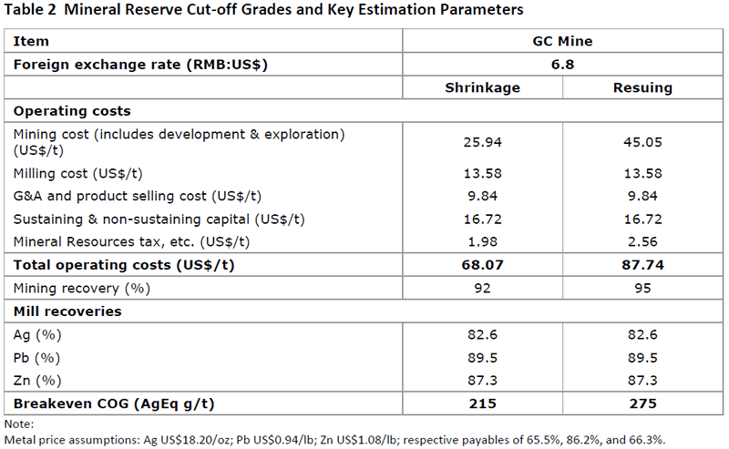 The Mineral Reserve estimates for the GC Mine were prepared by Silvercorp under the guidance of an independent Qualified Person (“QP”), Mr. H. A. Smith, P.Eng., of AMC, who takes QP responsibility for those estimates. The assumption has been made that current stoping practices will continue to be employed at the GC Mine, namely predominantly shrinkage stoping (69% of projected LOM), combined with some cut and fill resuing (31% of projected LOM), using hand-held drills and hand-mucking within stopes, and loading to mine cars by rocker-shovel or by hand. Minimum mining widths of 1.0 m for shrinkage and 0.5 m for resuing are assumed.
