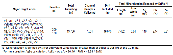 In addition to the drilling program, 16,070 m of exploration drift tunneling were developed at the GC mine during this period. The exploration tunneling, comprised of drifting, cross-cutting and raising, was driven along and across major mineralized vein structures to upgrade the drill-defined mineral resources and test for new parallel and splay structures. The results of the exploration tunneling are summarized in the following table.