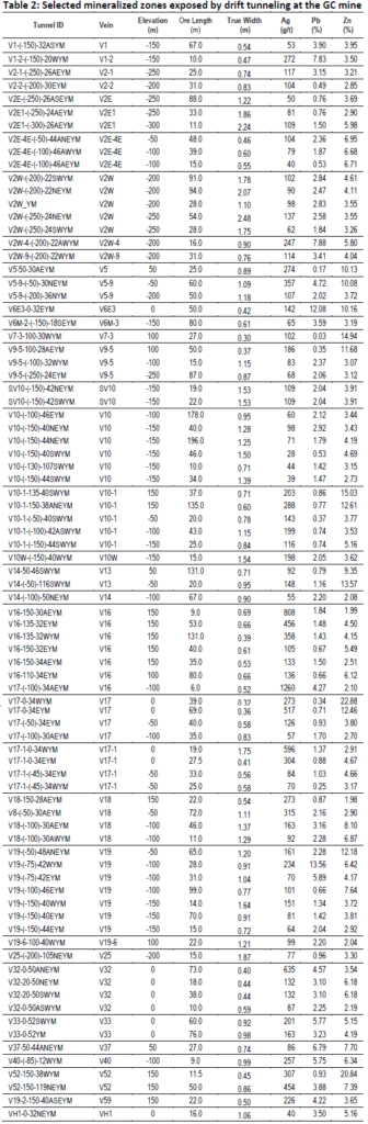 The high-grade intercepts from this period are associated with parallel silver-lead-zinc veins V2-2, V2-3, V2-4, V2-4E, V2-7, V2E, V2E1, V2E6, V2W, V2W-4, V2W-9, V5-7, V5-9, V7, V7-1, V7-1E, V7-3, V9-4, V9-5, V9W-2N, V9W-5, V10, V10-1, V10-20, NV10, V19, V19-8, V25, V25-1, and V25-4. Other veins include V11, V16, and NV28. There are 24 new vein structures discovered in and above the production areas, including V2E4, V2E-4E, V2E-8, V7-2, V7-5, V7S, V8-2, V8-5, V10-10, V10-11, C10-17, V10-1S, V10W, V18-2, V18-3, V18-4, V19-2, V19-7, and V19-8. The Company is currently working on a technical report on the GC mine to update the resources and reserves as of December 31, 2020. It is expected that mineralization in these structures can be converted quickly into reserves and mined with existing underground workings.