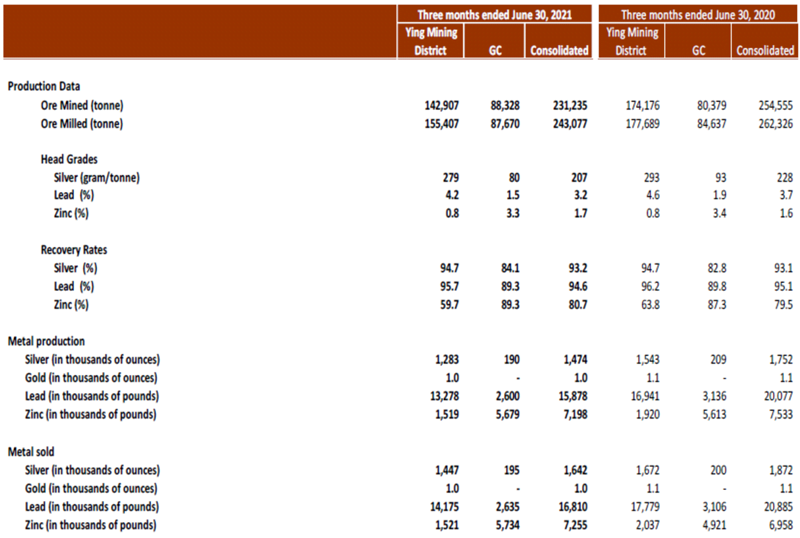 The production decline in the current quarter resulted mainly from the Company’s mining contracts renewal negotiations at the Ying Mining District. As reported in the Company’s news release dated April 28, 2021, the Company’s two-year mining contracts with the eight mining contractors at the Ying Mining District expired on March 31, 2021 and the parties reached a temporary two-month extension. During negotiations, some contract workers took breaks or left due to the uncertainty which caused some disruption to mining activities. When the contracts were renewed for an additional two year term in mid May 2021, it took some time for the contractors to bring back all their workers and ramp the operations back up to full capacity. Notwithstanding the production decline in Q1 Fiscal 2022, the Company expects to increase production in the remaining three quarters and meet its annual guidance to produce between 6.3 – 6.6 million ounces of silver, 65.7 – 68.9 million pounds of lead, and 26.9 – 28.5 million pounds of zinc in Fiscal 2022.