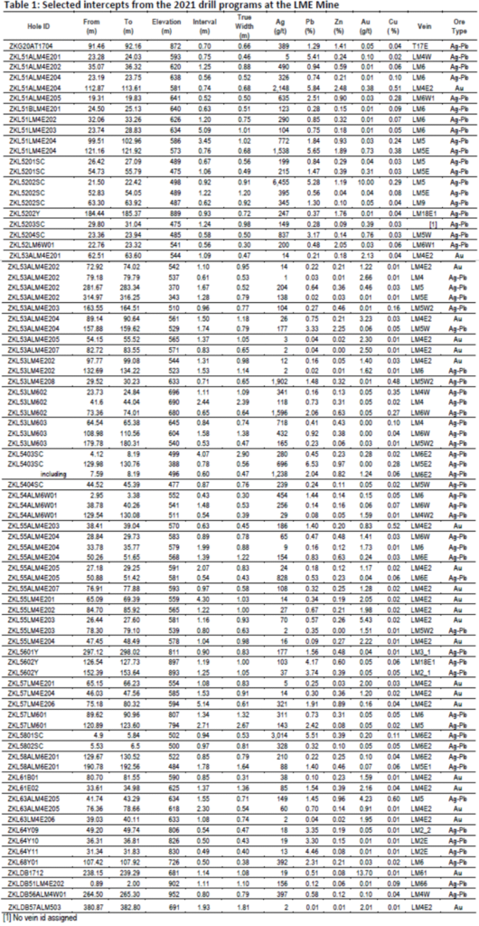 - Hole ZKL5202SC intersected a 0.92 m interval (0.91 m true width) of vein LM5 grading 6,455 grams per tonne (“g/t”) silver (“Ag”), 5.28% lead (“Pb”), 1.19% zinc (“Zn”), 10.00 g/t gold (“Au”), and 0.29% copper (“Cu”) at the 498 m elevation;