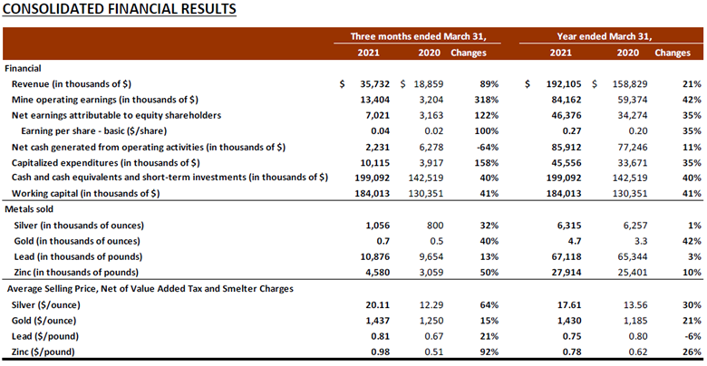 Compared to the prior year quarter, the Company’s consolidated financial results in Q4 Fiscal 2021 were mainly impacted by the following: i) an increase of 32%, 40%, 13%, and 50%, respectively, in silver, gold, lead and zinc sold; ii) an increase of 64%, 15%, 21%, and 92%, respectively, in the realized selling prices for silver, gold, lead, and zinc; offset by iii) a $0.8 million foreign exchange loss, and iv) a $1.1 million loss on equity investments.