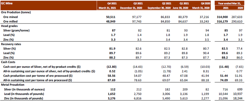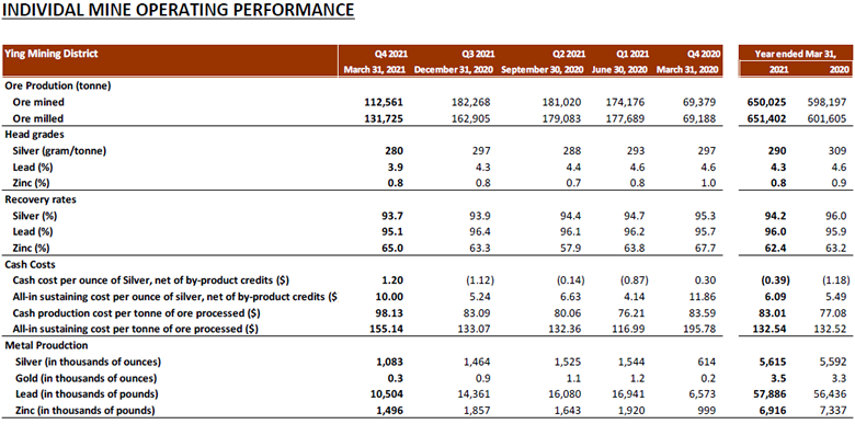The Company produced approximately 1.2 million ounces of silver, 300 ounces of gold, 12.2 million pounds of lead, and 4.7 million pounds of zinc, up 72%, 50%, 56%, and 43%, respectively, compared to approximately 0.7 million ounces of silver, 200 ounces of gold, 7.8 million pounds of lead, and 3.3 million pounds of zinc in Q4 Fiscal 2020.