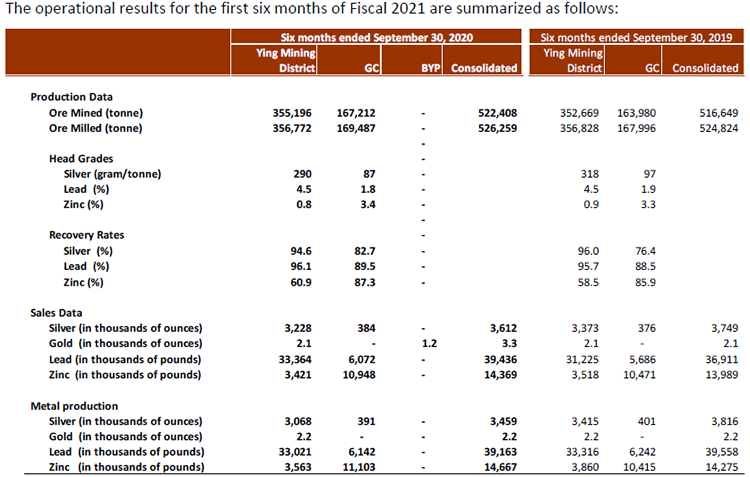 In Q2 Fiscal 2021, ore mined at the Ying Mining District was 181,020 tonnes, an increase of 3%, compared to 176,085 in Q2 Fiscal 2020. Ore milled was 179,083 tonnes, with average head grades of 288 grams per tonne (“g/t”) for silver, 4.4% for lead, and 0.7 % for zinc, compared to 179,147 tonnes of ore milled with average head grades of 306 g/t for silver, 4.5% for lead and 0.8% for zinc in Q2 Fiscal 2020. Metals production at the Ying Mining District in Q2 Fiscal 2021 was approximately 1.5 million ounces of silver, 16.1 million pounds of lead, and 1.6 million pounds of zinc, compared to approximately 1.7 million ounces of silver, 16.4 million pounds of lead, and 1.8 million pounds of zinc produced in Q2 Fiscal 2020.