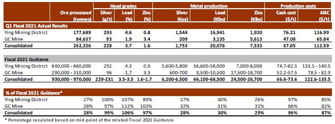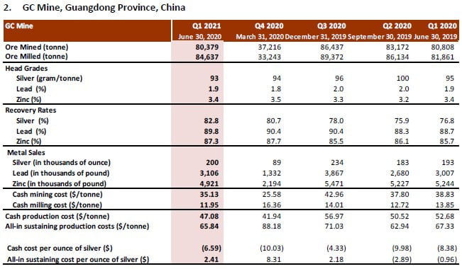 In Q1 Fiscal 2021, GC Mine sold approximately 200,000 ounces of silver, 3.1 million pounds of lead, and 4.9 million pounds of zinc, compared to 193,000 ounces of silver, 3.0 million pounds of lead, and 5.2 million pounds of zinc in Q1 Fiscal 2020.