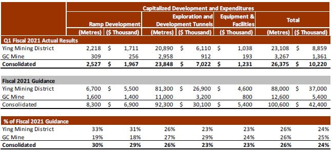 In Q1 Fiscal 2021, approximately 28,485 metres or $0.8 million worth of diamond drilling (Q1 Fiscal 2020 – 23,648 metres or $0.6 million) and 6,207 metres or $1.8 million worth of preparation tunnelling (Q1 Fiscal 2020 – 6,395 metres or $1.7 million) were completed and expensed as mining preparation costs at the Ying Mining District. In addition, approximately 23,108 metres or $7.8 million worth of horizontal tunnels, raises, ramps and declines (Q1 Fiscal 2020 – 20,895 metres or $7.1 million) were completed and capitalized.