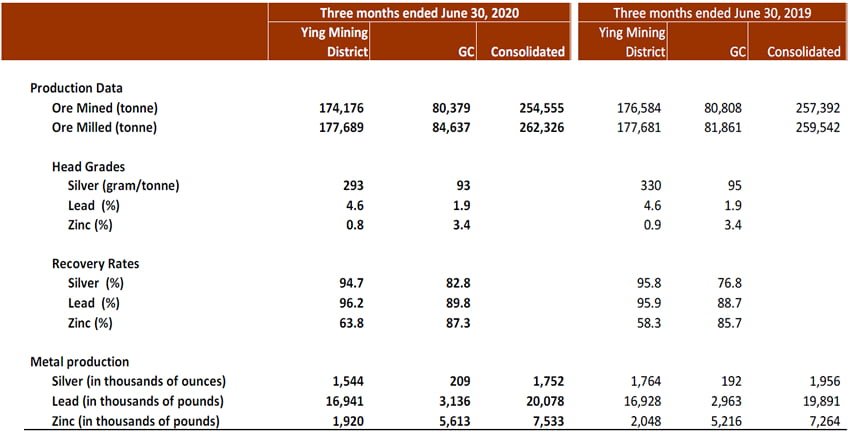 Ore mined at the Ying Mining District was 174,176 tonnes, a slight decrease compared to 176,584 tonnes in Q1 Fiscal 2020. Ore milled was 177,689 tonnes, with average head grades of 293 grams per tonne (“g/t”) for silver, 4.6% for lead, and 0.8% for zinc, compared to 177,681 tonnes ore milled with head grades of 330 g/t for silver, 4.6% for lead, and 0.9% for zinc. The variation in the Q1 Fiscal 2021 silver head grade is mainly related to the Company’s planned mining sequence and is in line with the guidance previously provided for Fiscal 2021.