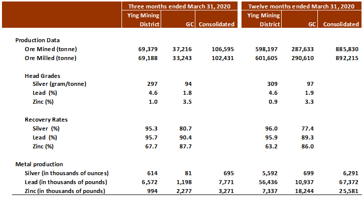 In Q4 Fiscal 2020, ore mined at the Ying Mining District was 69,379 tonnes, a decrease of 41,653 tonnes compared to 111,032 tonnes in the three months ended March 31, 2019 (“Q4 Fiscal 2019”). Correspondingly, ore milled was 69,188 tonnes, a decrease of 37,851 tonnes compared to 107,039 tonnes in Q4 Fiscal 2019. Average head grades were 297 g/t for silver, 4.6% for lead, and 1% for zinc in Q4 Fiscal 2020.