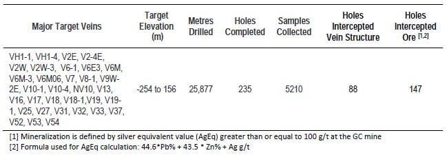 - Hole 19CK26A03 intersected a 0.82m interval from 36.73m to 37.55m, 0.46m true width, of vein V7 grading 300 grams per tonne (“g/t”) silver (“Ag”), 16.54% lead (“Pb”) and 4.14% zinc (“Zn”) at the -210m elevation;