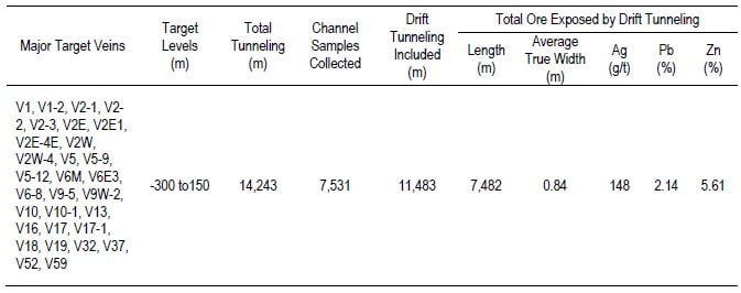 The exploration tunneling, comprising drifting, crosscutting and raising, was driven along and across major mineralized vein structures to upgrade the drill-defined mineral resources and test for new parallel and splay structures, and summarized in the following table: