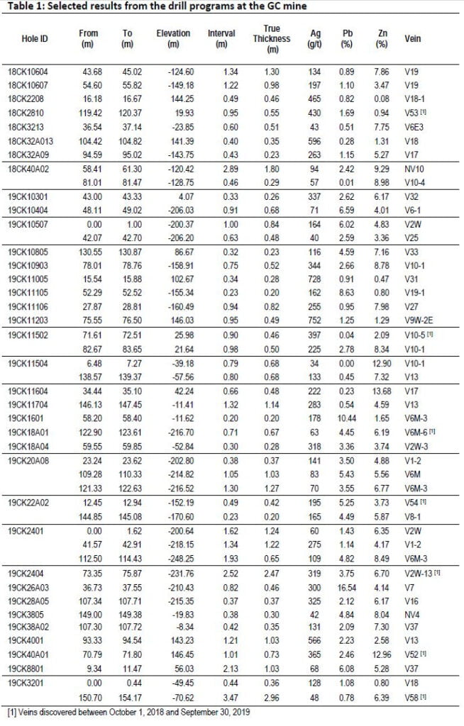 - Hole 19CK40A01 intersected a 1.01m interval from 70.79m to 71.80m, 0.73m true width, of newly discovered vein V52 grading 365 g/t Ag, 2.46% Pb and 12.96% Zn at the 146m elevation;
