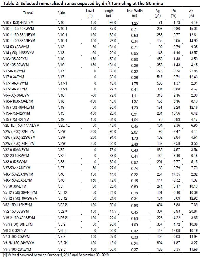 - Drift Tunnel V52-150-119NEYM exposed mineralization 50m long and 0.86m wide (true width) grading 454 g/t Ag, 3.88% Pb and 7.39% Zn within newly discovered vein structure V52 on the 150m level; and