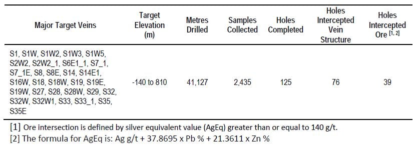 - Hole ZK10S18E002 intersected a 1.07m interval from 4.96m to 6.02m, 1.04m true width, of vein S14E1 grading 1,000 g/t Ag, 0.46% Pb and 0.51% Zn at the 452m elevation, and a 0.61m interval from 155.38m to 156.00m, 0.57m true width, of vein S35E grading 231 g/t Ag, 1.04% Pb and 0.09% Zn at the 393m elevation; and