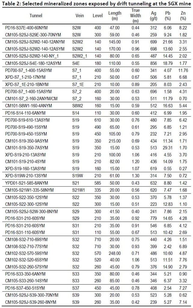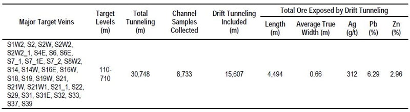 The exploration tunneling at the SGX mine, comprising of drifting, crosscutting and raising, was driven along and across major mineralized vein structures to upgrade drill defined mineral resources and test for new parallel and splay structures, and is summarized in the following table: