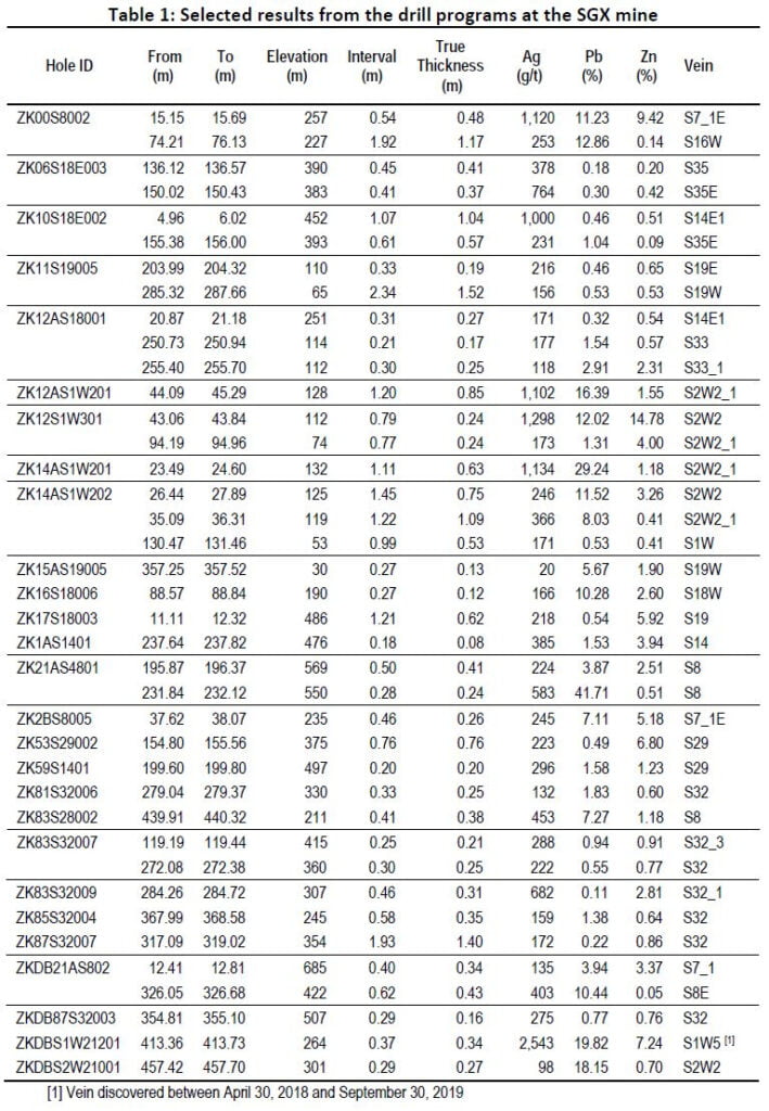 From April 1, 2018 to September 30, 2019, the Company completed 41,127 metres (“m”) of diamond drilling with 7 underground rigs and 30,748m of exploration tunneling between elevation levels 110m and 710m. Results from underground drilling extended the major mineralized vein structures along strike and downdip, and exploration tunneling exposed high grade mineralized zones within major production vein structures. During this period, many mineralized parallel and splay structures were discovered near the known mineralized zones. Particularly, the new discovery of the parallel veins S1W3 and S1W5 with significant drill results within the S1 zone has expanded the mineralization to the northwest of the SGX mine. In addition, results from the drilling and tunneling programs have confirmed that the mineralized vein S32 at the SGX mine is the same vein structure as vein HZ20 at the HZG mine to the south of the SGX mine. The combined strike length of this vein structure is approximately 2,800m, with tunneling and infill drilling still ongoing at the connecting area of this vein structure.