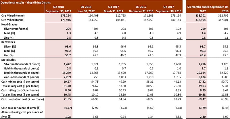For the six months ended September 30, 2017, a total of 333,701 tonnes of ore were mined and 338,904 tonnes milled at the Ying Mining District, down by 5% and 3%, compared to 352,702 tonnes mined and 347,901 tonnes milled in the same prior year period. Average head grades were 299 g/t for silver, 4.4% for lead, and 0.8% for zinc compared to 305 g/t for silver, 4.7% for lead, and 1.1% for zinc, respectively, in the same prior year period.