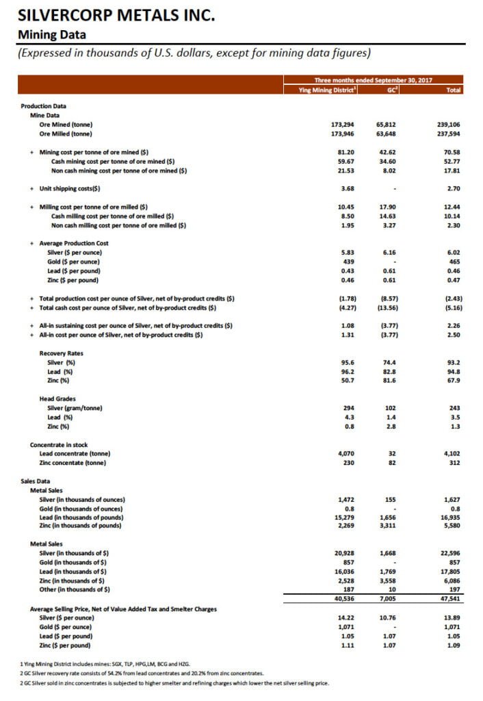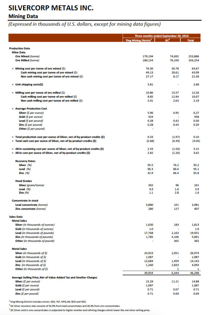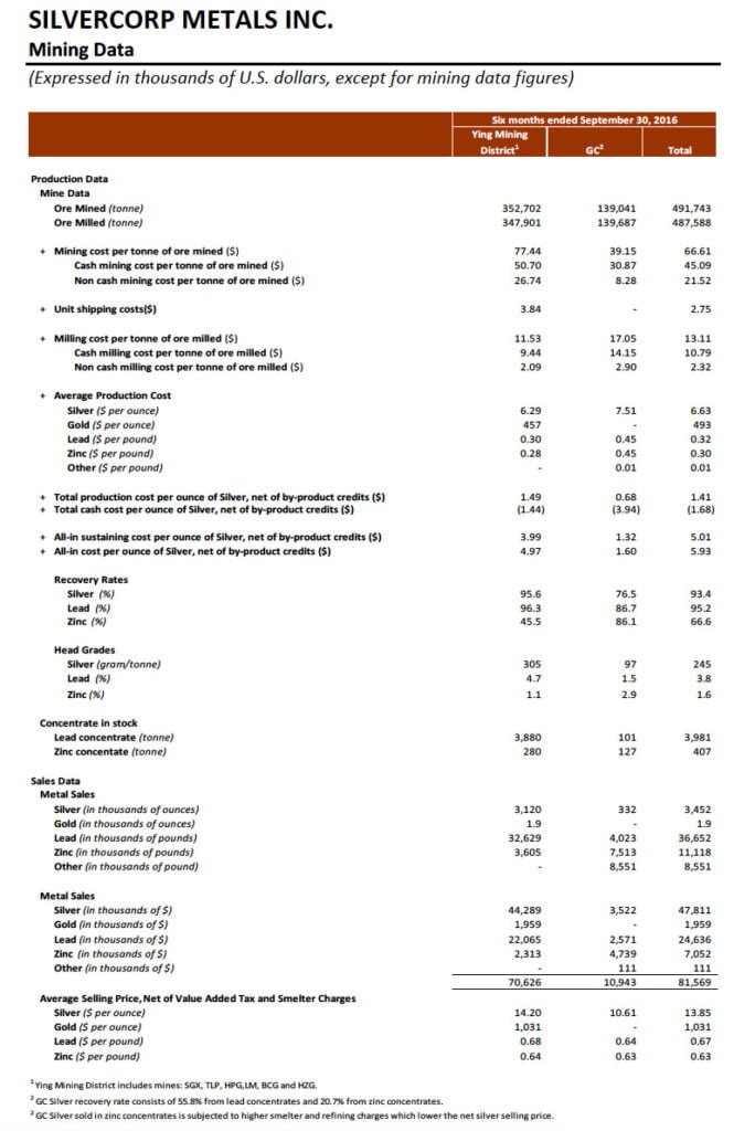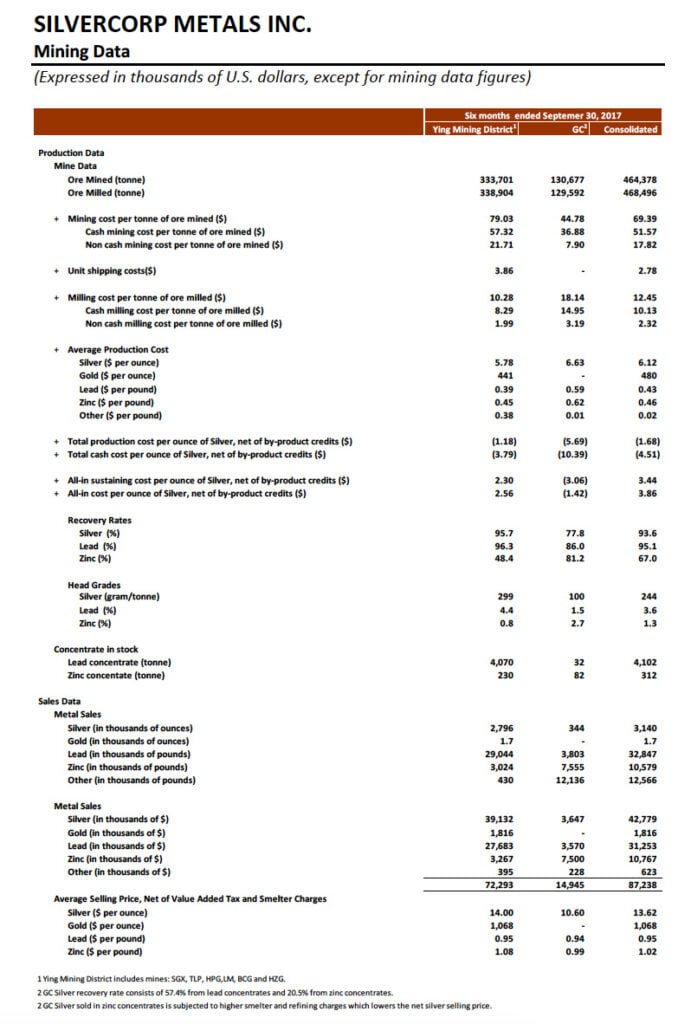 For the six months ended September 30, 2017, approximately 3.1 million ounces of silver, 1,700 ounces of gold, 32.8 million pounds of lead, and 10.6 million pounds of zinc were sold compared to 3.5 million ounces of silver, 2,000 ounces of gold, 36.7 million of lead, and 11.1 million pounds of zinc sold in the same prior year period; the consolidated total mining and cash mining costs were $69.39 and $51.57 per tonne, 4% and 14% increase compared to $66.61 and $45.09 per tonne in the same prior year period while the consolidated total milling costs and cash milling costs reduced by 5% and 6% to $12.45 and $10.13, respectively, compared to $13.11 and $10.79 per tonne in the same prior year period; and, the consolidated cash production costs and all-in sustaining costs per ounce of silver, net of by-product credits, were negative $4.51 and $3.44 compared to negative $1.68 and $5.01, respectively, in the same prior year period.