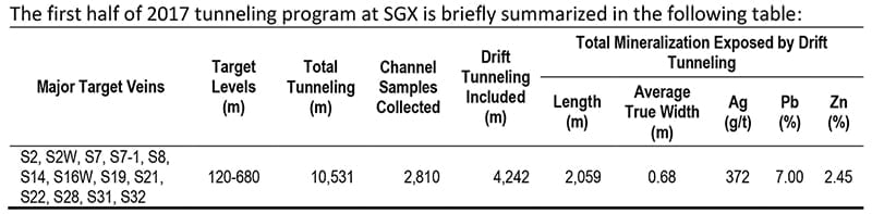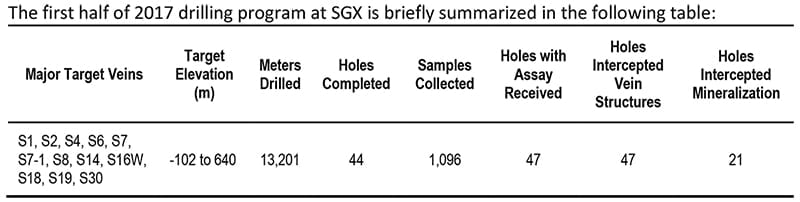 The 2017 exploration program at the SGX mine consists of underground drilling and tunneling. As of June 30, 2017, the Company completed 13,201 meters (“m”) of underground diamond drilling with 7 underground rigs and 10,531m of exploration tunneling. Results of the underground drilling and drift tunneling continuously extended the major mineralized vein structures along strike and downdip.