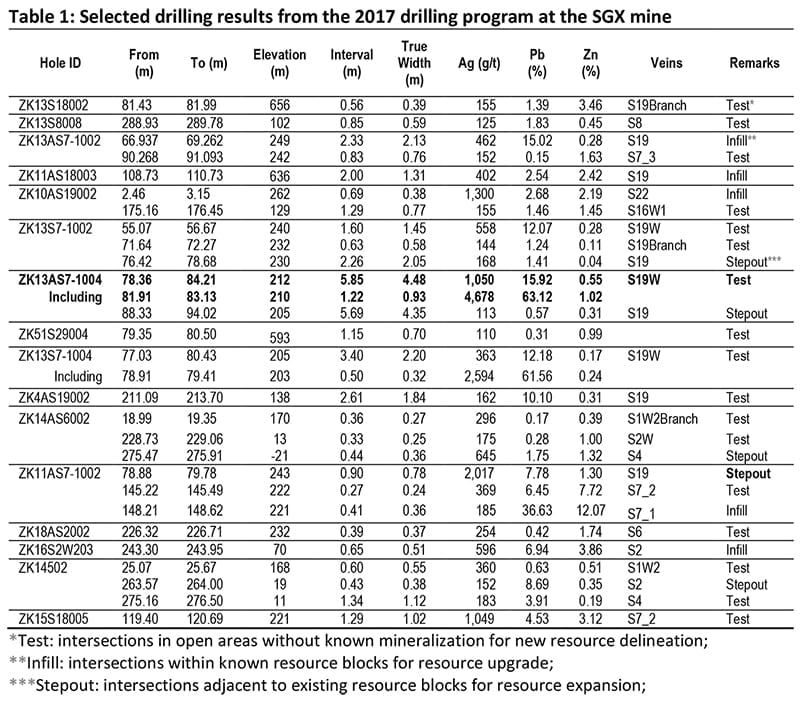 - Hole ZK13AS7-1004 intersected a 5.85m interval from 78.36m to 84.21m, 4.48m true width, of vein S19W grading 1,050 grams per tonne (“g/t”) silver (“Ag”), 15.92% lead (“Pb”) and 0.55% zinc (“Zn”) at the 212m elevation, including an 1.22m interval from 81.91m to 83.13m, 0.93m true width grading 4,678g/t Ag, 63.12% Pb and 1.02% Zn;