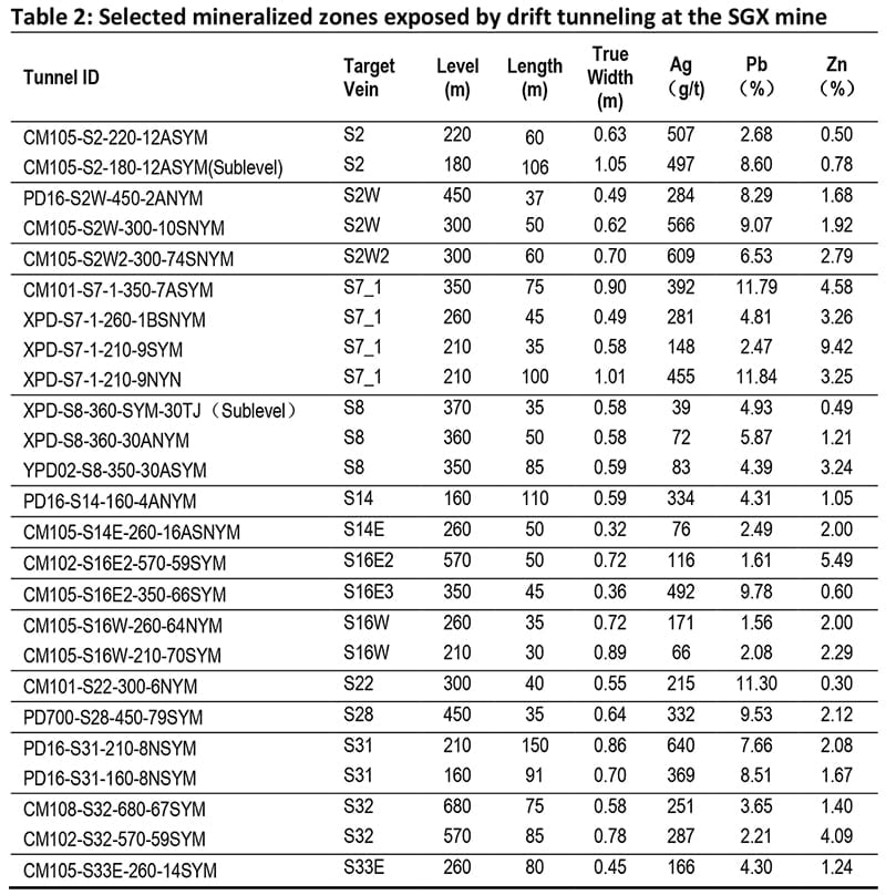 - Drift Tunnel XPD-S7-1-210-9NYM exposed mineralization of 100m long and 1.01m wide (true width) grading 455g/t Ag, 11.84% Pb and 3.25% Zn within vein structure S7-1 on the 210m level; and